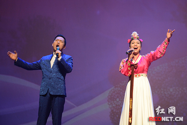 其中,来自湖南歌舞剧院的青年歌唱家仇韬兀、莫娟娟,共同联唱了一首韩国民谣《阿里郎》,现场观众一边跟着节拍击掌,一边摇动着身子,跟着轻声哼唱。《阿里郎》与高丽时期流传下来的一个爱情故事有关,是朝鲜民族具有代表性的经典曲牌,不论在世界的哪个角落,只要是韩国人都知晓《阿里郎》。
