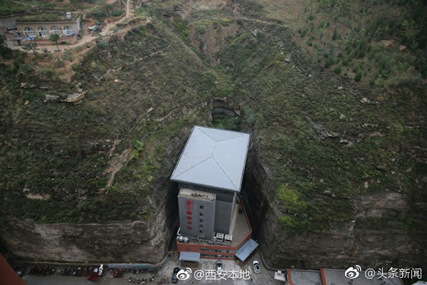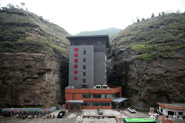 近日,有网友在陕西延安延川县拍到了一栋建在两山夹缝间的建筑,楼体距离旁边山体距离最近处只有三四米,许多人戏称这栋建筑为“肉夹馍”式大楼。图片来源:@西安本地 文字来源:北京青年报