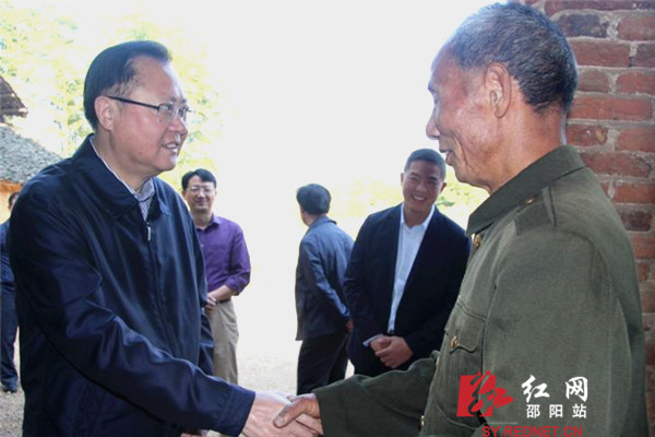 邵阳市委书记、市人大常委会主任龚文密(左)在九龙岭镇三合村看望老党员王和青。