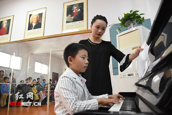 “这首《山娃》它其实是一个非常有趣、很诙谐的曲子,你可以想象成猫捉老鼠一样。将想象力融入到音乐旋律中会弹得更好。”在音乐课堂上,沈诗哲仔细聆听着学弟学妹们的钢琴演奏并进行指点。她还告诉学弟学妹弹钢琴最自然的手型才是最好的手型,就像手握鸡蛋一样。