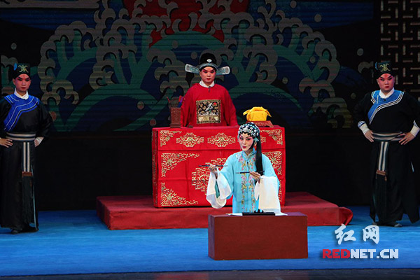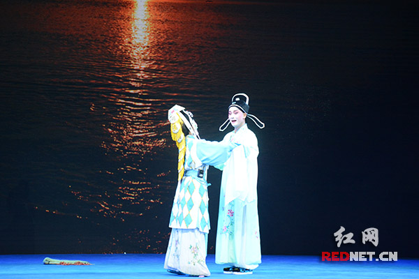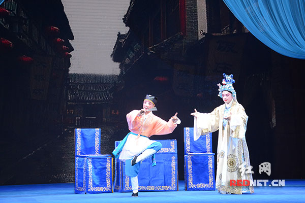 周帆(前)表演湘剧《陈三两爬堂》选段。