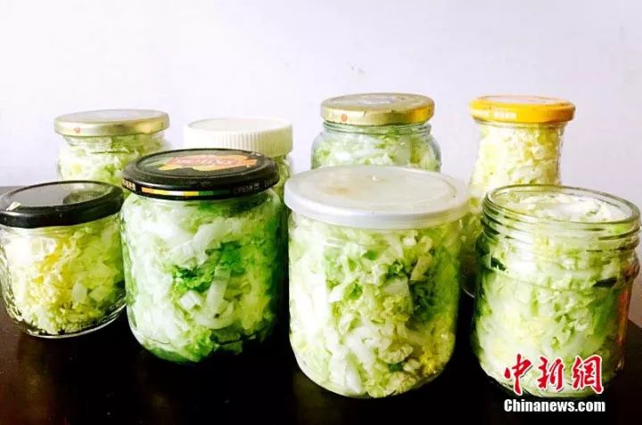她们利用起家里大大小小的瓶瓶罐罐,白菜切丝、浸盐,塞进罐子里密封,简单方便省地方。味道跟大缸腌的比起来差点意思,但过过酸菜瘾已经足够!