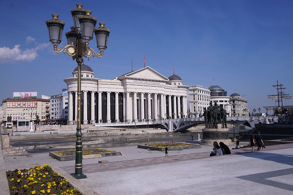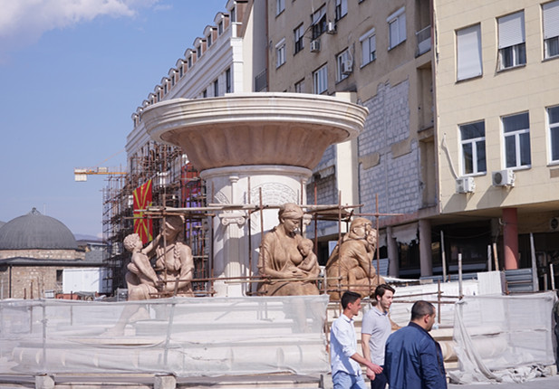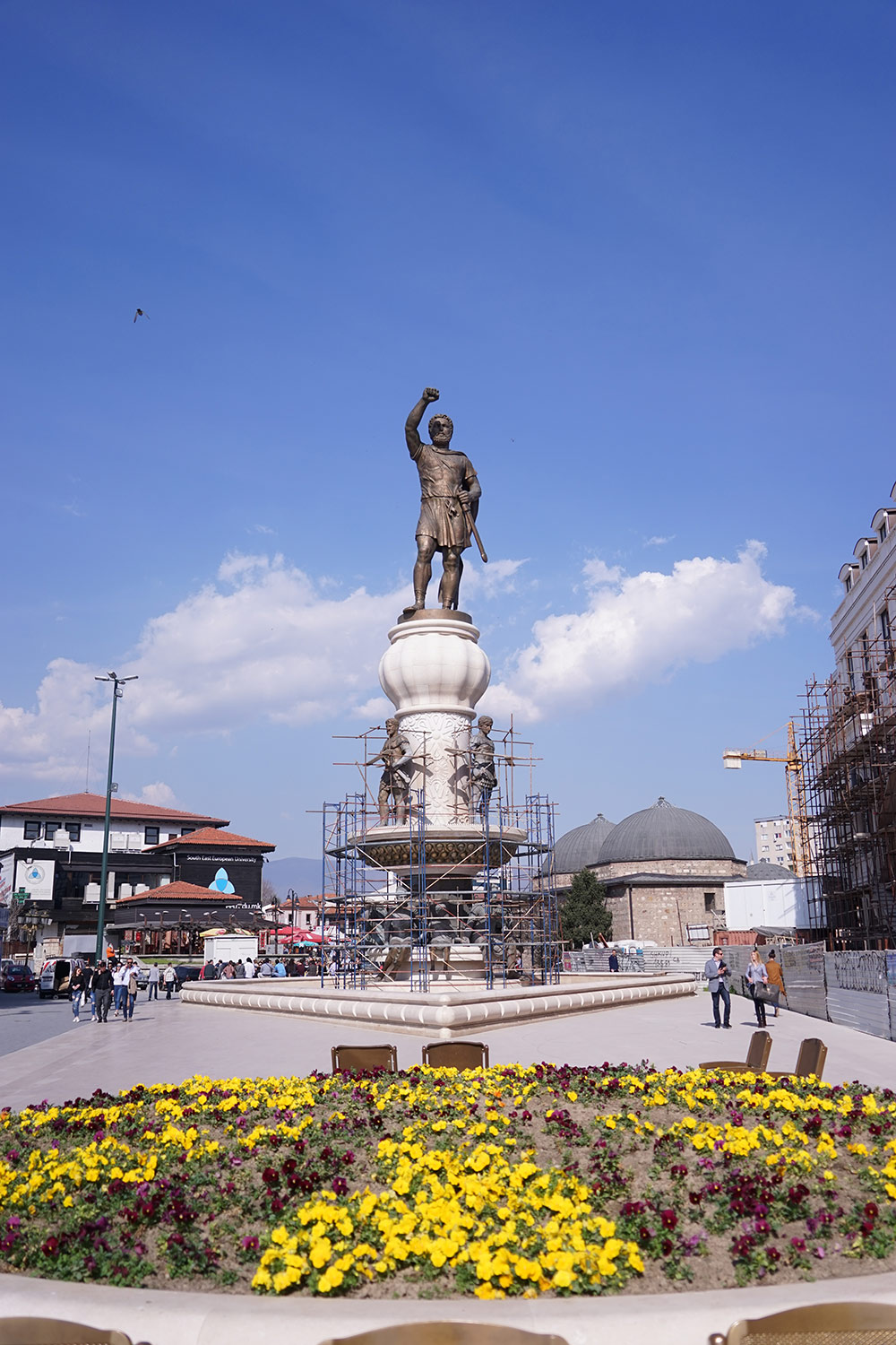 告别保加利亚,到达斯科普里,马其顿共和国首都,是在我登临巴尔干半岛的第四天。在一条弯曲、狭窄的公路上颠簸了好一阵,来到一处古城堡下停住,导游意欲带领我们一行凭高一览斯科普里新城,只见:不远处,一条波光盈盈的小河旁,满是不言宏伟,也还新颖、时髦的楼堂馆所,据说都是马其顿政府聘请日本的设计师新近建造的。一心关注亚历山大大帝的我被告知:想了解亚历山大大帝,仅有这城市广场的一座座铜像,马其顿政府花巨资在这座新城里建造了许许多多铜像,宣传亚历山大大帝,还有别的伟人,为此,一度遭人诟病。