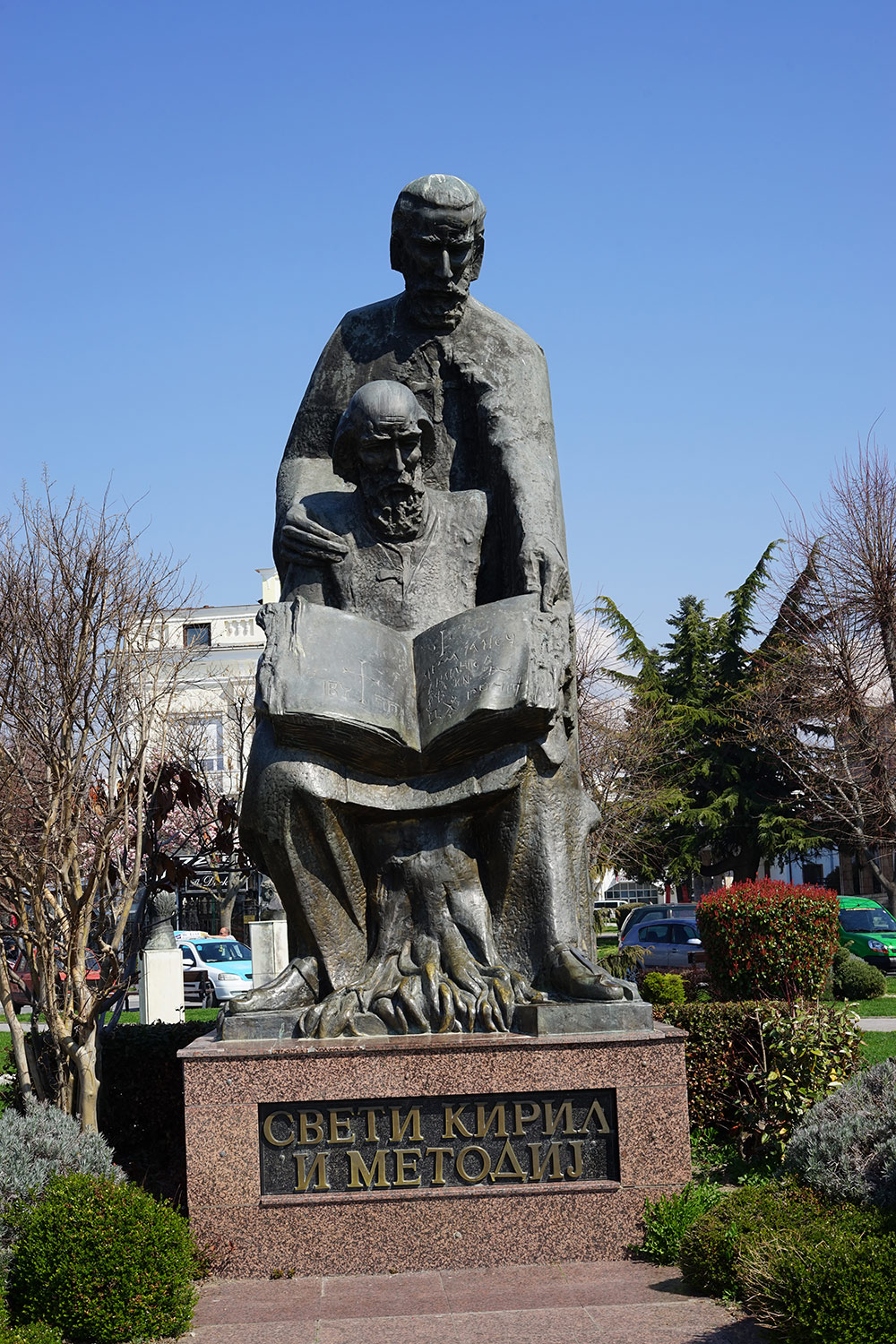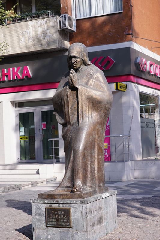 广场上,两位学者的铜像也引起我的关注,他们是圣西里尔和梅托迪乌斯,格拉哥里字母——最早的斯拉夫语字母的“原创”。俩兄弟一起将基督教经典翻译成斯拉夫方言,对于如今巴尔干半岛及整个斯拉夫语言的语言的形成与发展影响深远。文字!稍有历史常识的我知晓其对于一个民族生存、发展的伟大意义。如果没有至今仍在使用的斯拉夫文字,很难说会有而今的马其顿、罗马尼亚、保加利亚、波黑、塞尔维亚诸国!也许正是因为马其顿人看到这一点,才毫不掩饰地以西里尔、梅托迪乌斯为傲,在城市里最繁华的地段让其与伟大的亚历山大大帝、特蕾莎修女为伴!