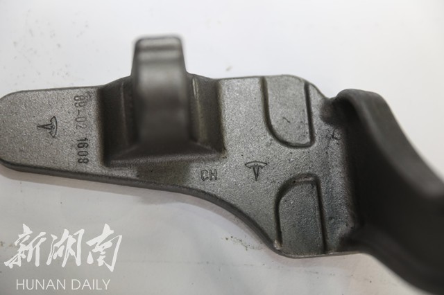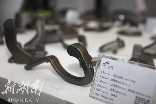 新湖南11月22日讯(李秉钧 尹振亮 罗徽)11月22日,2017湖南经济合作洽谈会暨第八届湘商大会、第五届中国湘南国际承接产业转移投资贸易洽谈会开幕,郴州国际会展中心的“江南铸都”嘉禾锻造展馆惊艳亮相,里面宝贝让人眼前一亮,其中特斯拉汽车门铰链,吸引不少人观赏。