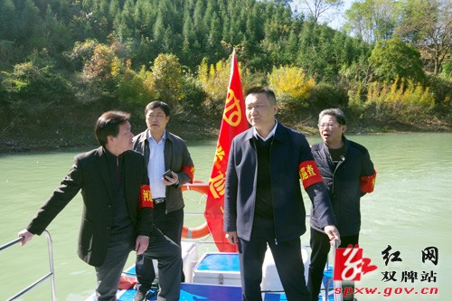 在双牌水库大坝码头,肖质彬一行统一佩戴“巡查”袖章,乘船一路向南,察看河道水质、河岸整治、河长公示牌等情况,在巡河途中发现河道中存在生活垃圾等各种漂浮物、网箱养鱼、抬网等现象。肖质彬要求,要加大河流巡查督查和日常监管力度,对发现的问题要认真研究,明确职责,结合实际,对存在问题限期进行治理整改。