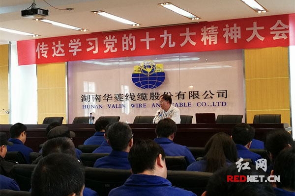 党的十九大代表、华菱湘钢党委书记王树春24日为华菱线缆干部职工宣讲党的十九大精神。