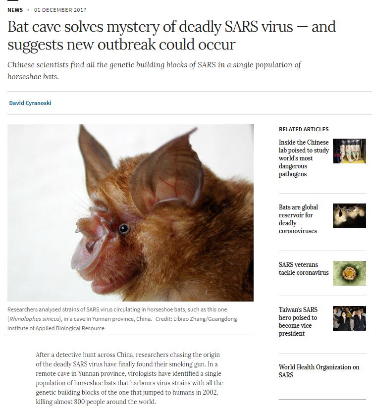 近日,中国科学院武汉病毒研究所石正丽与崔杰课题组在SARS冠状病毒起源与进化研究中取得新进展,该团队在我国云南省发现了一处蝙蝠SARS样冠状病毒的天然基因库,揭示了SARS冠状病毒可能的重组起源。
