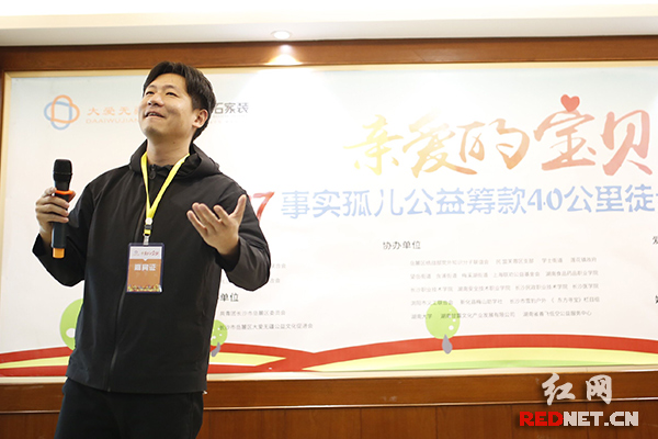“亲爱的宝贝”40公里徒步挑战活动由大爱无疆公益文化促进会和共青团长沙市岳麓区委员会共同发起,其目的是为事实孤儿筹集助学款。徒步筹款活动从步步高梅溪新天地出发,途径梅溪湖、莲花镇、含浦街道、到达农趣谷,全程40公里。