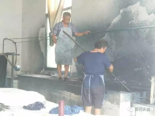 刮版后的坯布放进蒸筒里高温熏蒸后,投入染缸搅拌。染缸里的颜料是用石灰和板蓝根混合后形成的蓝靛液。刚捞出的布料颜色浅,经过一次次的浸泡,颜色不断加深,经过七染八晒,坯布颜色最终定格为青色。