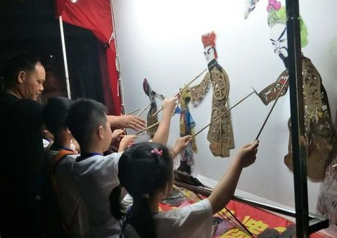孩子们与“非遗”传承人,一起体验皮影戏。