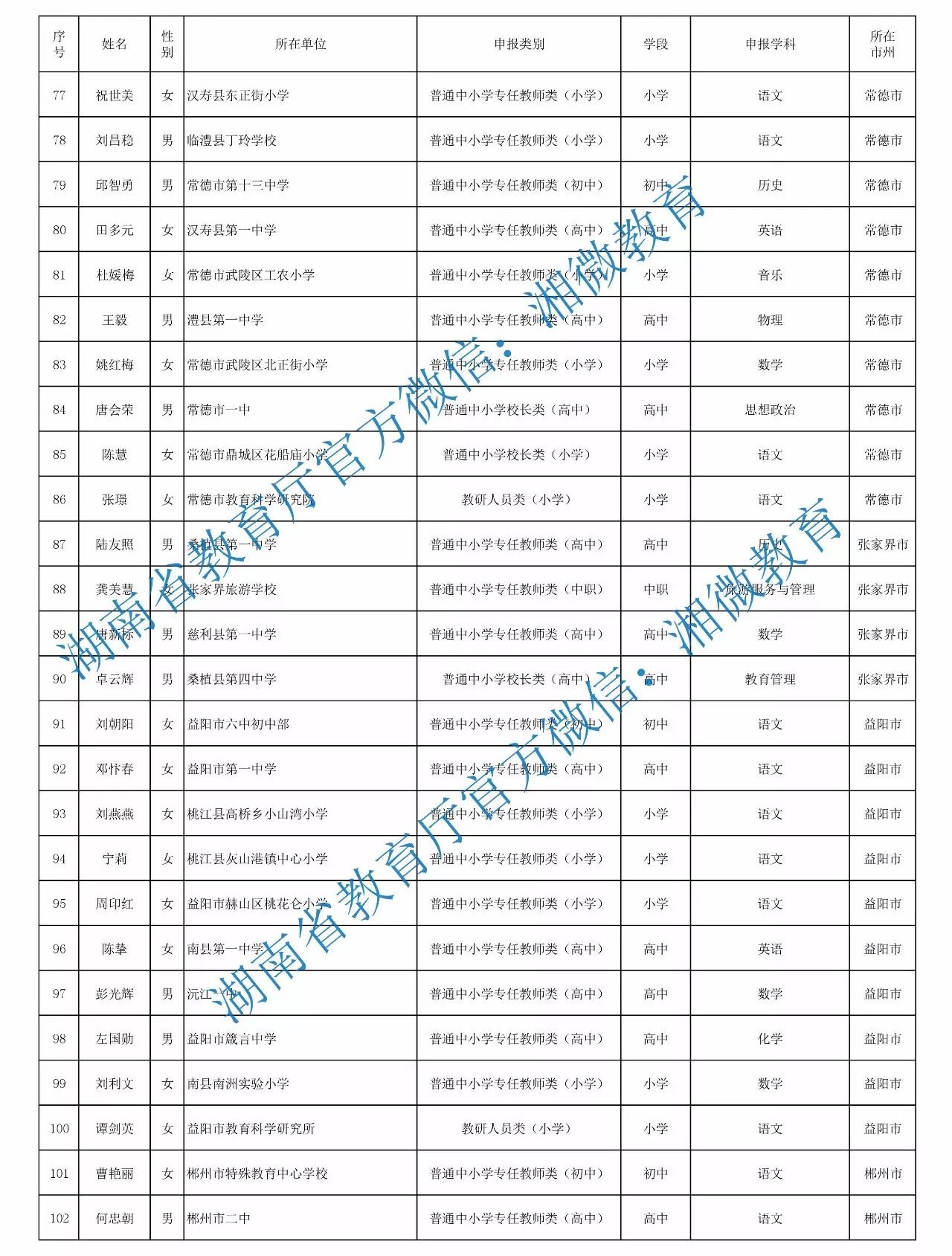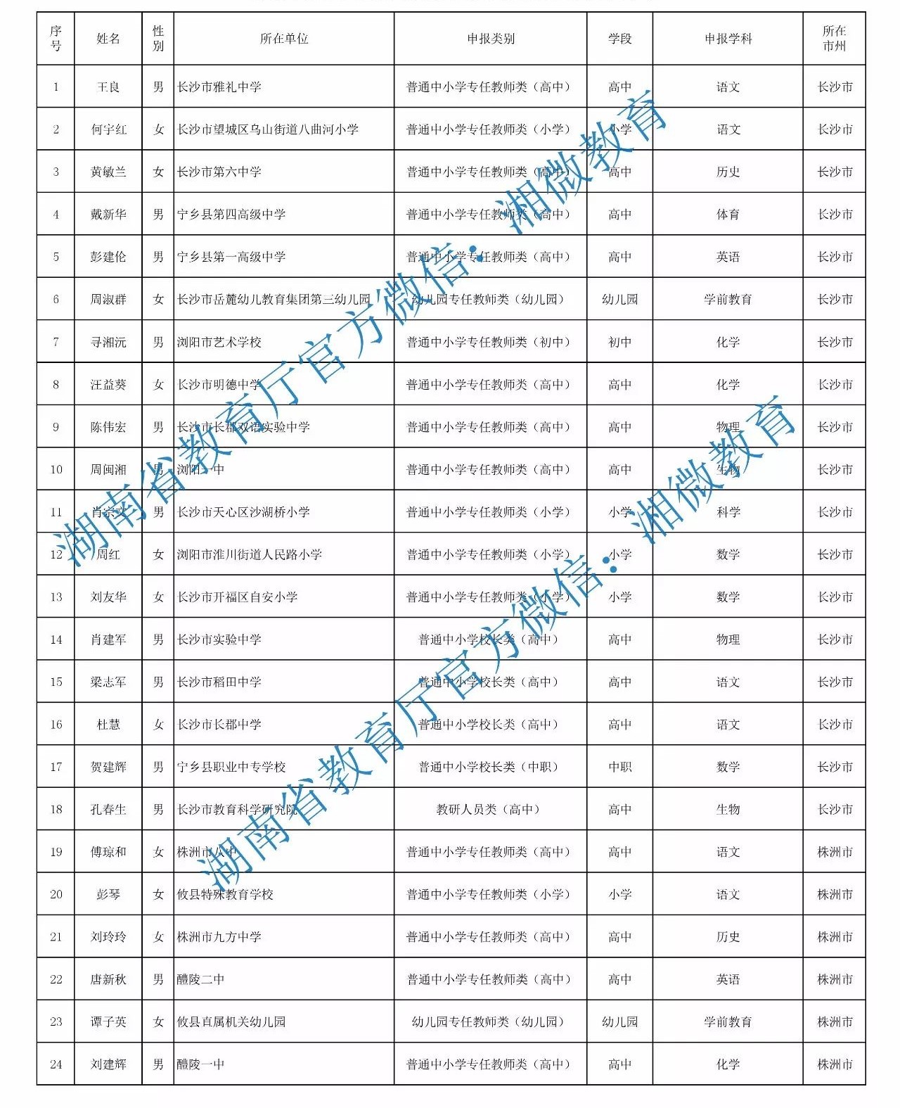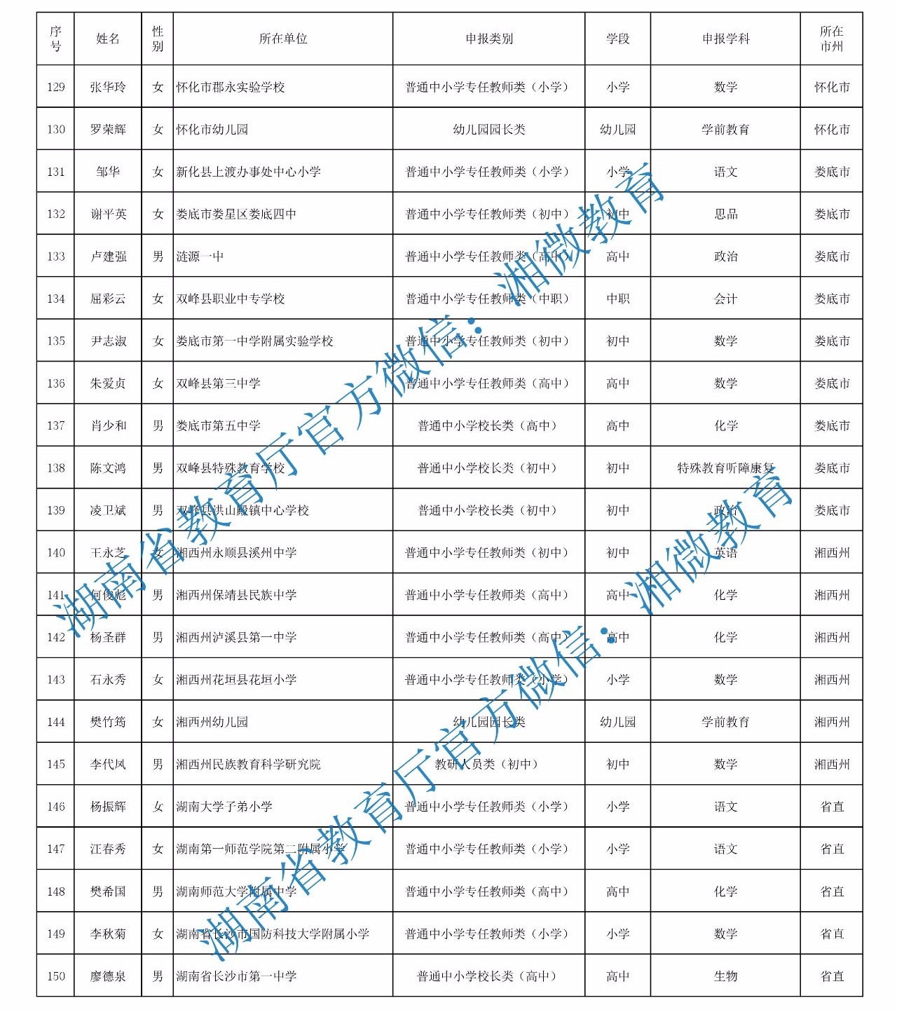 根据省教育厅《关于印发<湖南省特级教师评选标准(试行)>的通知》(湘教发〔2014〕57号)和《关于开展湖南省第十届特级教师评选工作的通知》(湘教通〔2017〕324号)精神,经教师个人申报、学校(单位)、县市区教育(体)局和市州教育(体)局考核推荐,省特级教师评审委员会评审,王良等150名同志拟被评为湖南省第十届特级教师,现予以公示。公示期为5个工作日,从2017年12月14日起至12月20日止。公示期内,如有不同意见,请实名以电话、邮件、来访等形式向省教育厅教师工作与师范教育处反映。