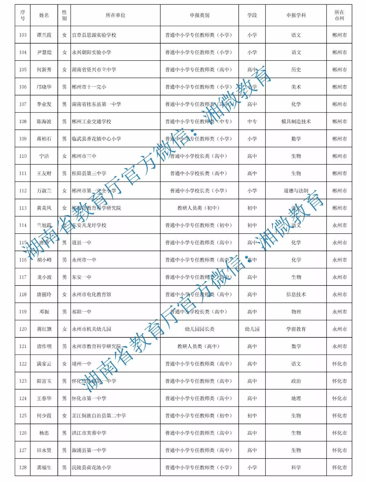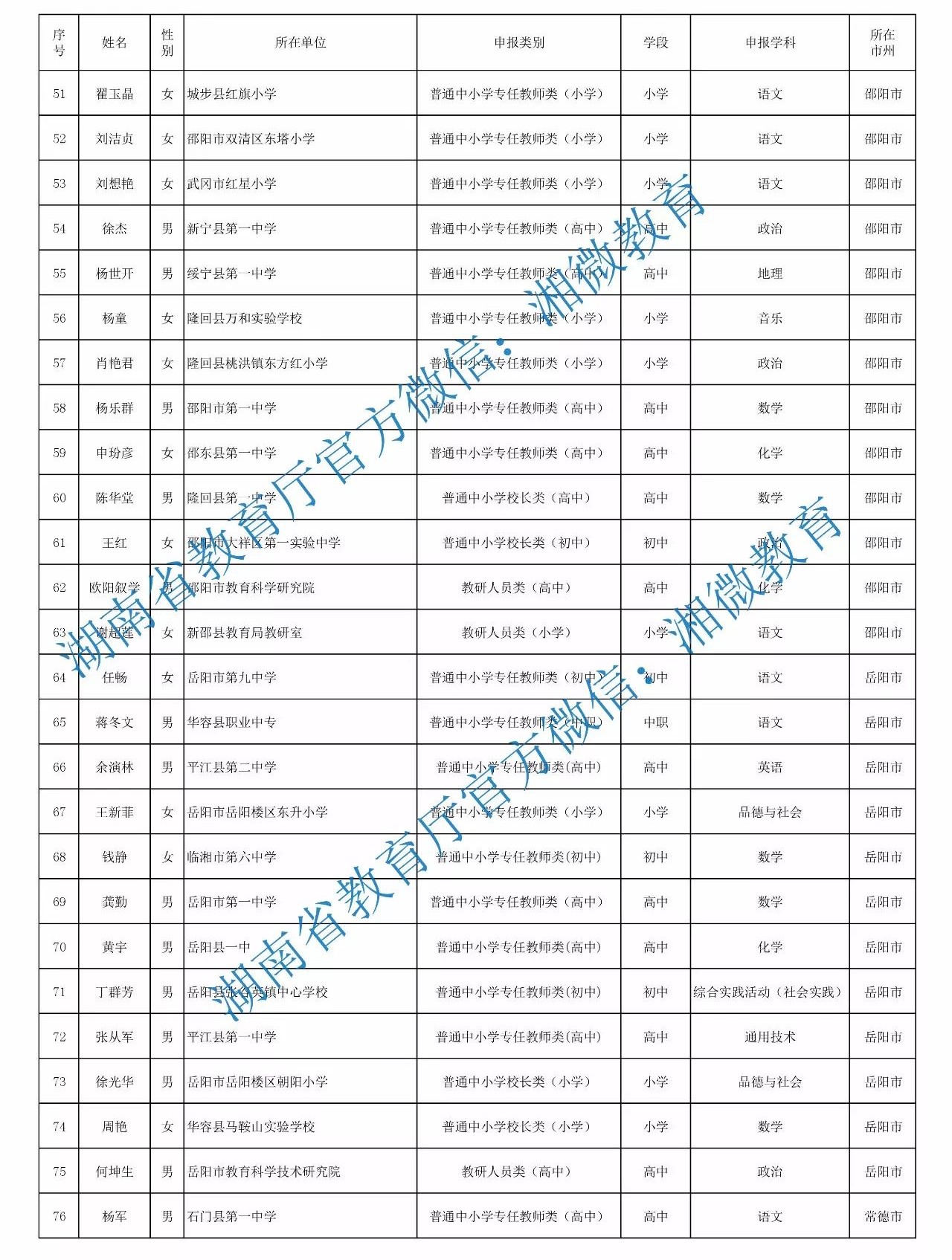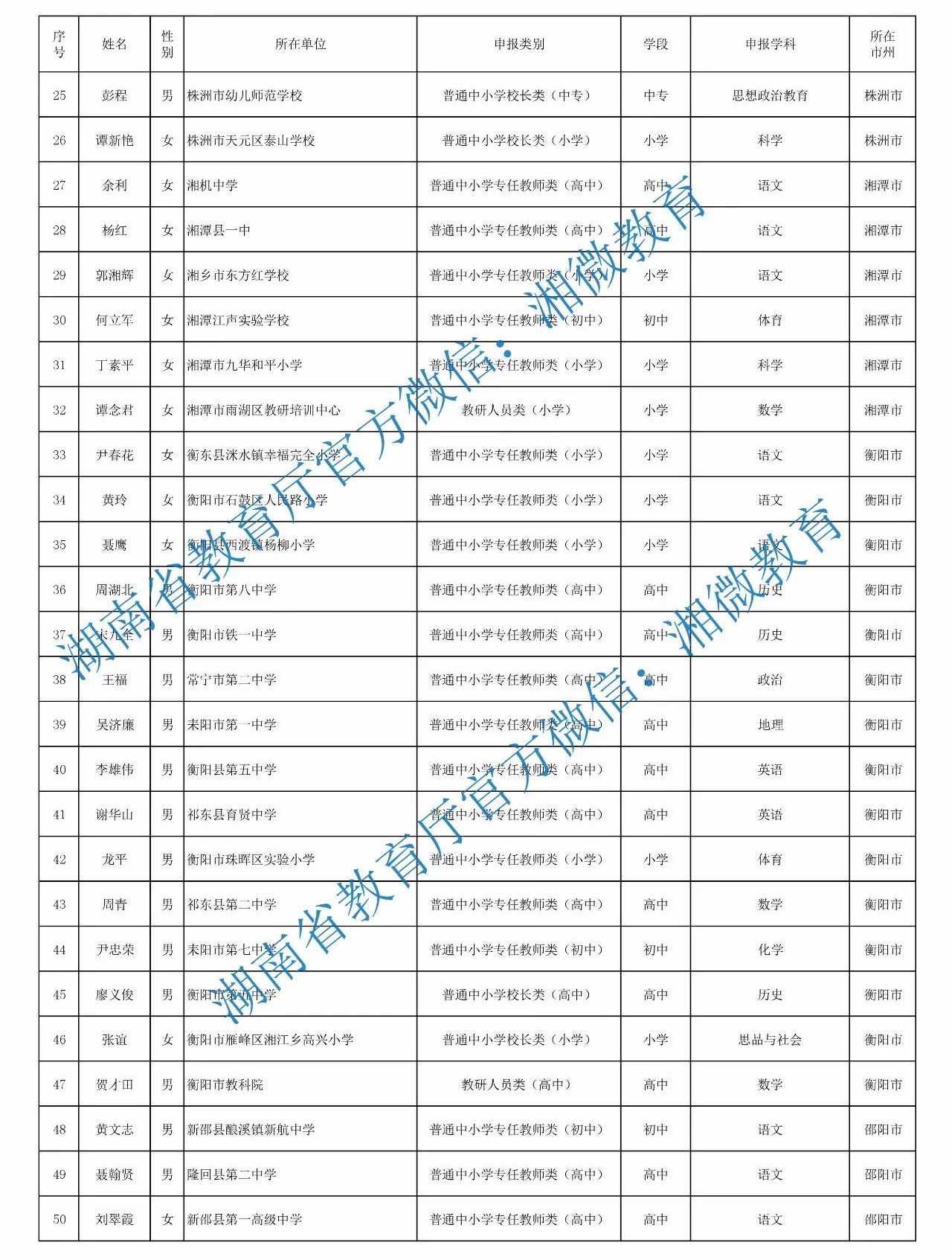 根据省教育厅《关于印发<湖南省特级教师评选标准(试行)>的通知》(湘教发〔2014〕57号)和《关于开展湖南省第十届特级教师评选工作的通知》(湘教通〔2017〕324号)精神,经教师个人申报、学校(单位)、县市区教育(体)局和市州教育(体)局考核推荐,省特级教师评审委员会评审,王良等150名同志拟被评为湖南省第十届特级教师,现予以公示。公示期为5个工作日,从2017年12月14日起至12月20日止。公示期内,如有不同意见,请实名以电话、邮件、来访等形式向省教育厅教师工作与师范教育处反映。