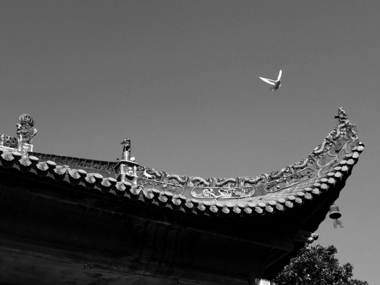12月18日,晴,长沙开福寺,一只寺里的鸽子飞过天王殿。
