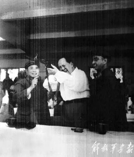△1964年,毛泽东同志在全军比武大会上,用神枪手使用过的枪支瞄准。