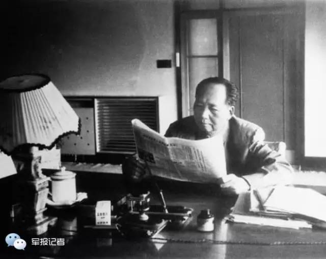△1962年,毛泽东在武汉东湖住地阅读《解放军报》