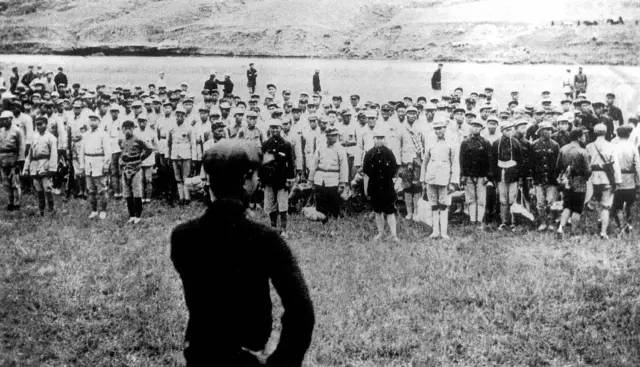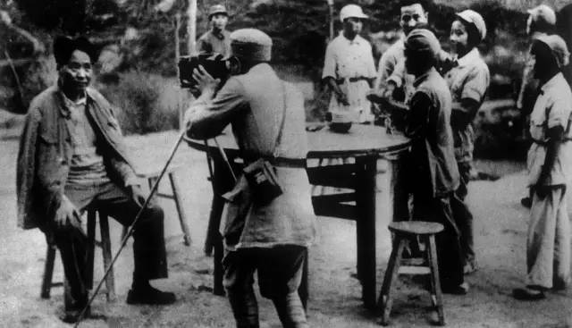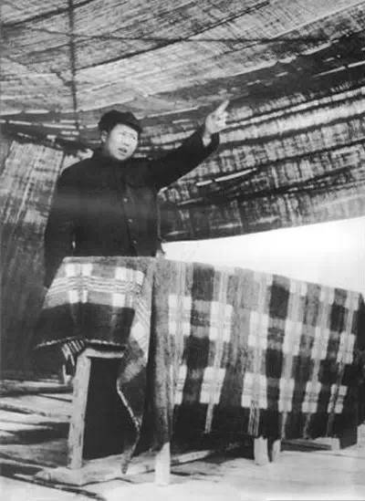 △1942年,延安,毛泽东、朱德与高级干部集会。