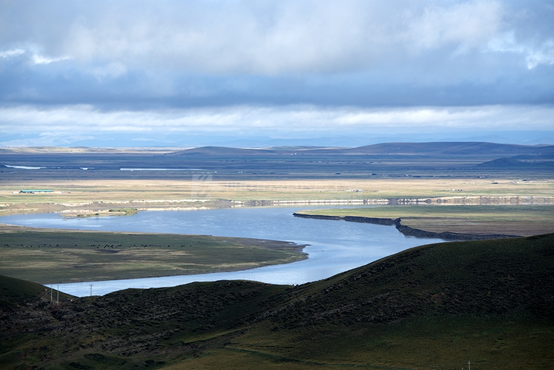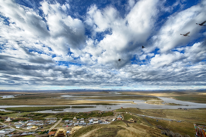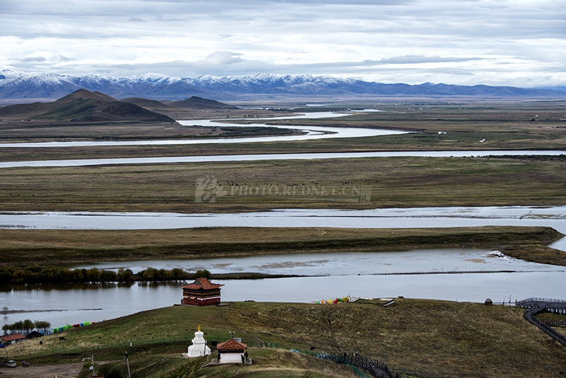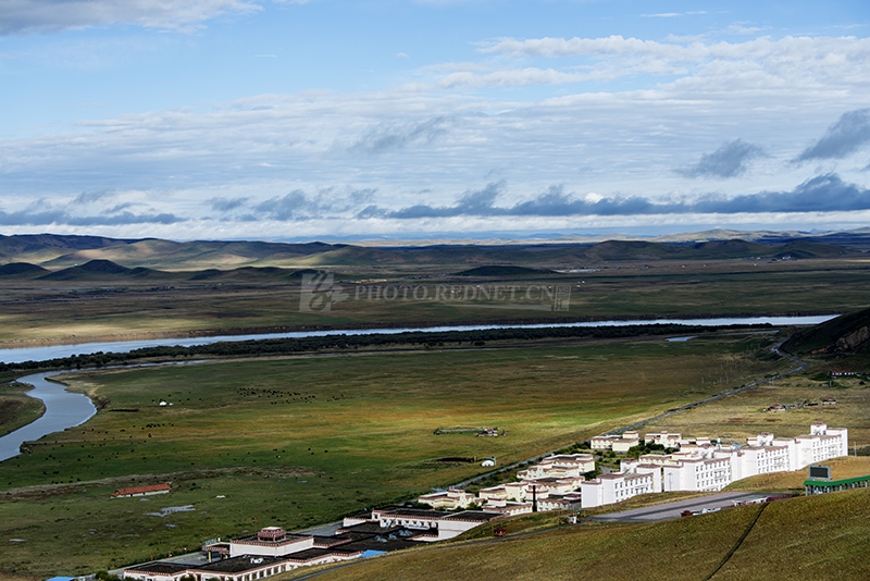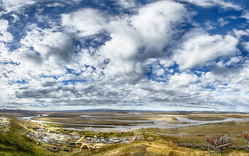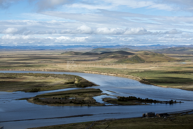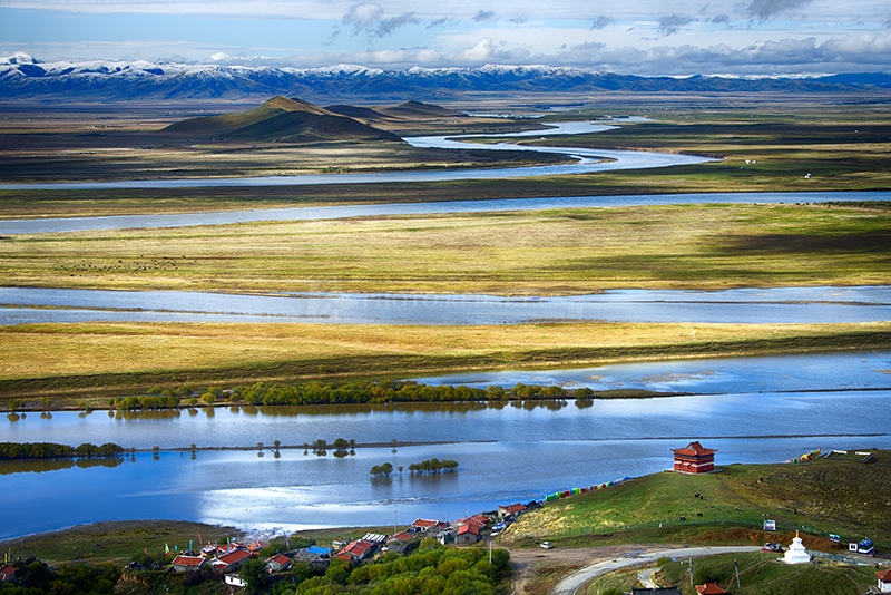 黄河九曲第一湾位于若尔盖县唐克乡,地处四川、青海、甘肃三省交。黄河自甘肃一侧来,白河自黄河第一湾湾顶汇入,型如“S”型,犹如仙女的飘带自天边缓缓飘来,在四川边上轻轻抚摸一下又转身飘回青海。故此地称黄河九曲第一湾。