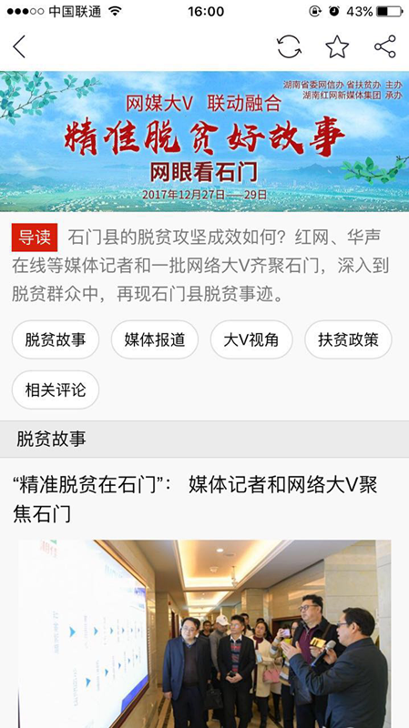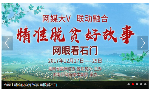 来自中国网、今日头条、红网、时刻新闻、华声在线、新浪湖南、凤凰网湖南等全国新闻工作者用鲜活的镜头,生动的笔触,深入挖掘这石门精准脱贫的发展变化。随后,在湖南的主流媒体、主流门户,一大批新闻报道纷纷出炉,真实地展示了石门县的脱贫攻坚成效。红网在PC端和时刻新闻客户端同步推出专题《精准脱贫好故事网眼看石门》,并在首页焦点图位置重点推荐。专题涵盖“脱贫故事”“媒体报道”“大V视角”“扶贫政策”“相关评论”5个方面,总点击量超过10万人次。