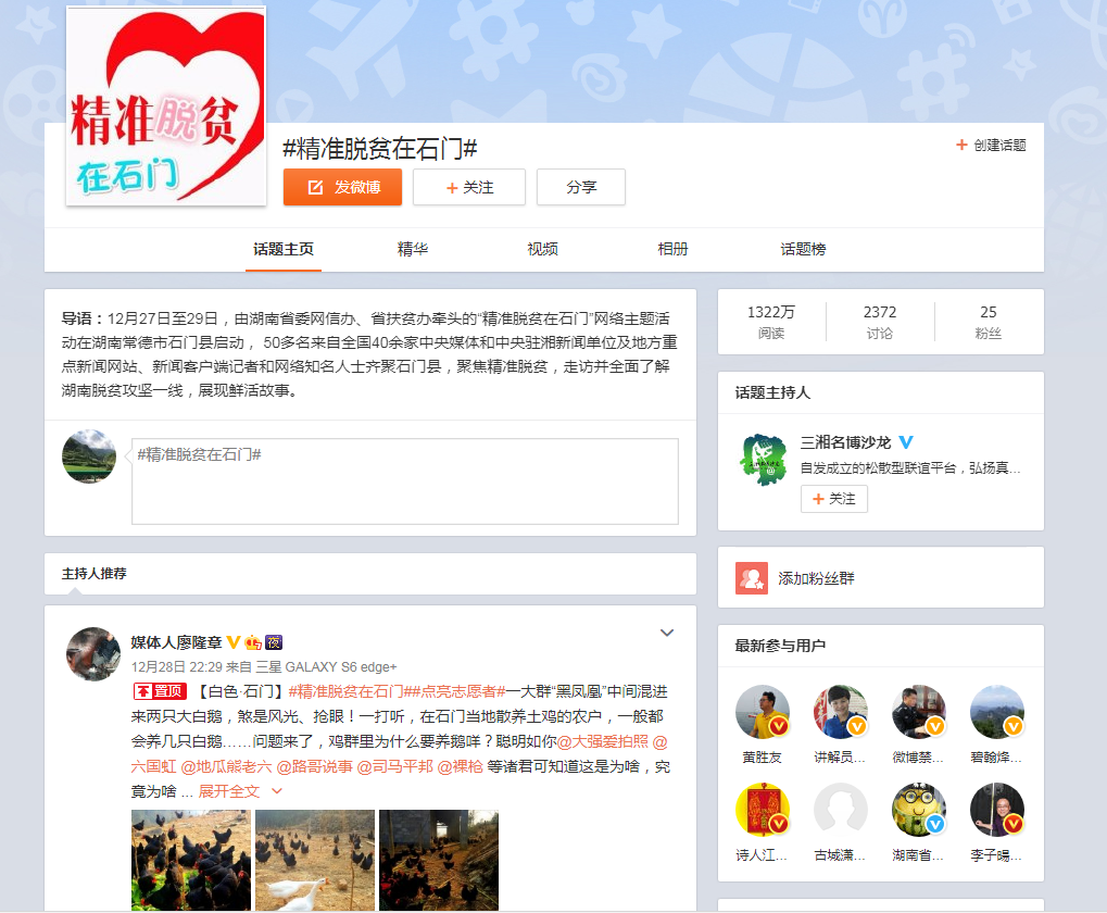 新浪微博上由网络大V发起的微博话题#精准脱贫在石门#异常活跃,截至29日中午,微博话题“精准脱贫在石门”共有1322万的阅读量,2372讨论次数。