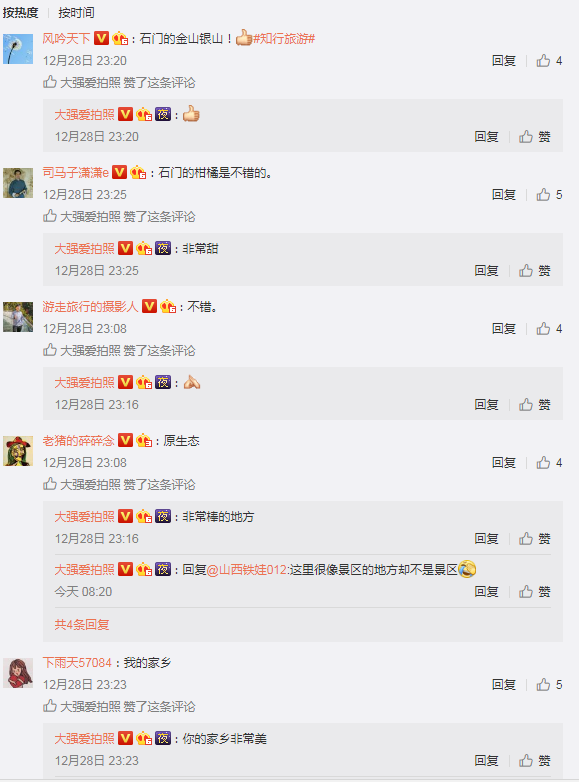 网络大V还不忘在微博推介石门的物产和旅游。“石门县,位于湖南省常德市,是湘西北门户。区域内矿产资源丰富,特产丰富,旅游资源众多。是我国的名茶之乡、柑橘之乡。”12月29日下午3点,网络大V@大强爱拍照发布的这条微博,短短45分钟之类就吸引了227名网友转发,评论213条,点赞263次。网友关注石门脱贫故事的同时,更爱上了石门的金山银山和原生态景观。