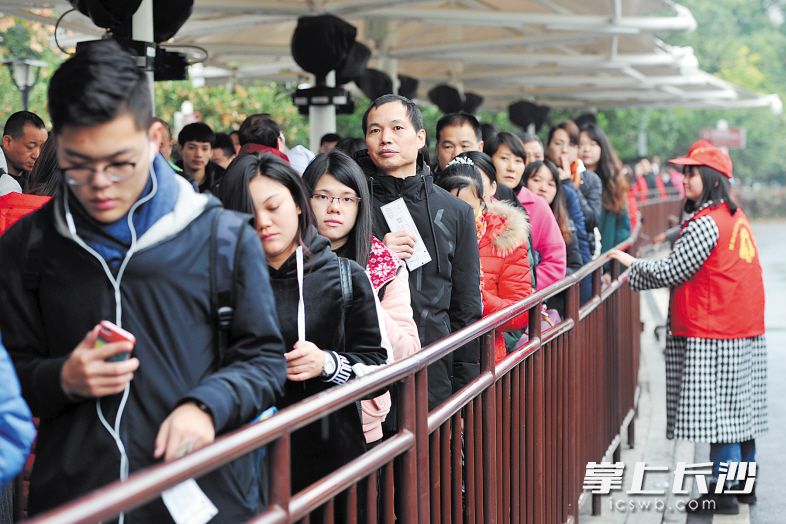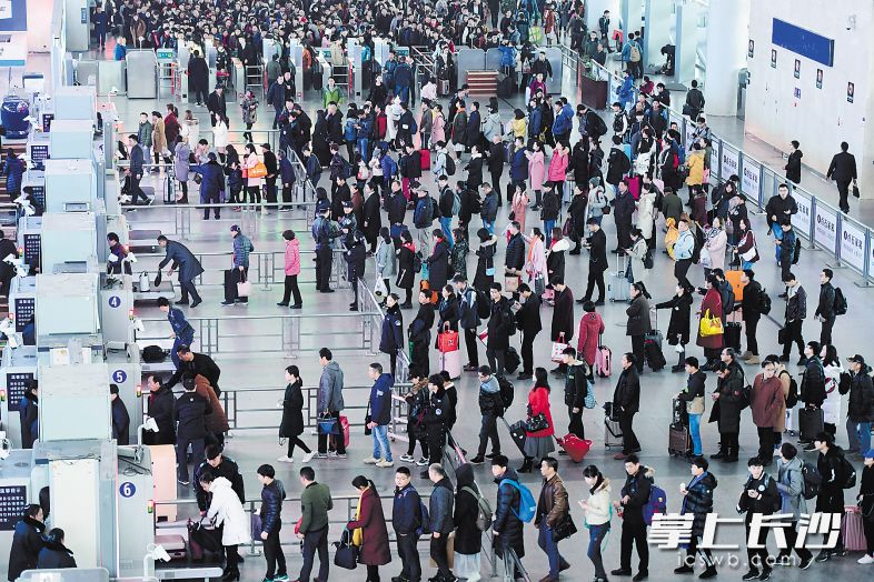 元旦小长假期间,长沙火车南站客流激增,等候安检的旅客排成了长队,现场秩序井然。