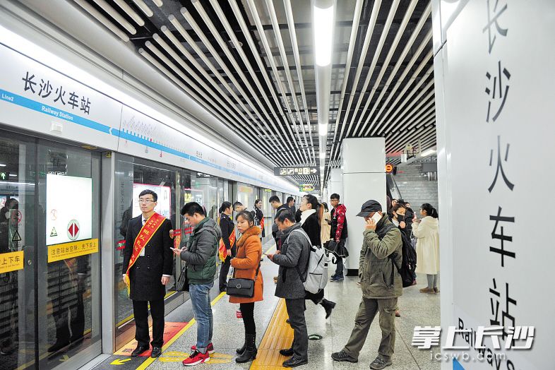 长沙地铁2号线长沙火车站站内,等候上车的乘客有序排队。均为长沙晚报记者 王志伟 摄