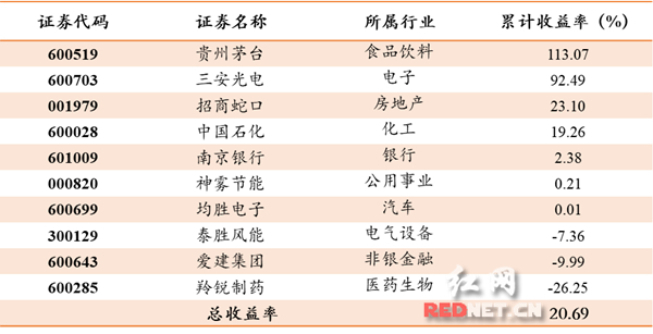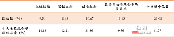 截至2017年最后一个交易日,十大金股组合(等权)收益率为20.69%,相对与上证综指、深证成指、创业板指、股票型公募基金平均收益率和全市场涨跌中位数的超额收益分别为14.13%、12.21%、31.36%、9.56%和41.77%,远远跑赢市场主要基准指数以及和市场中主要机构参与者。