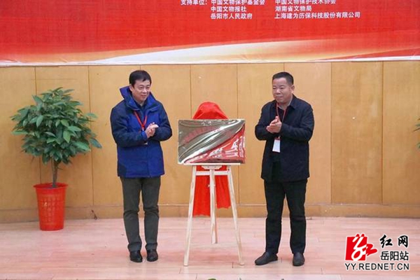 湖南省文物局副局长江文辉(右)、湖南理工学院党委书记李明(左)共同为湖南省文物保护重点研究基地揭牌。