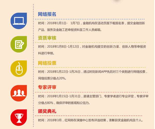 湖南十大金融新闻、湖南金融创新力量、湖南金融工匠,具体该如何选?评选活动相关负责人介绍,活动共分为网络报名、资质审核、专家评审、网络投票、公示结果等五部分。