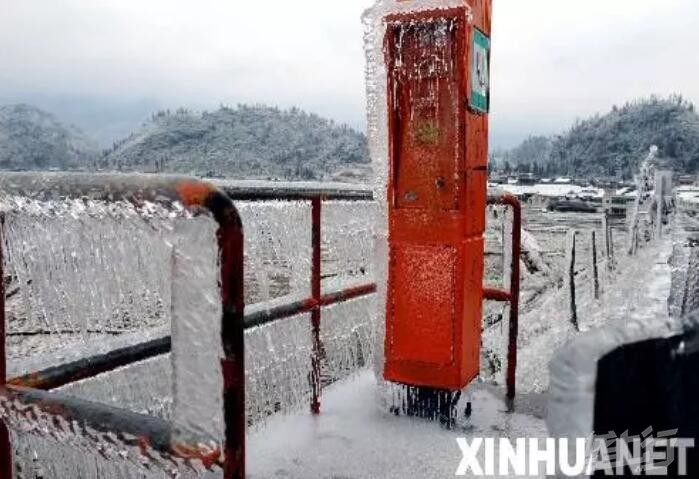 2008年2月2日,京珠高速公路韶关乳源路段旁的紧急电话亭被冰包围。