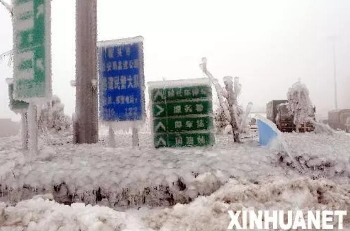 2008年2月2日,京珠高速公路韶关云岩服务区旁的指示牌和花坛被厚厚的冰层覆盖。
