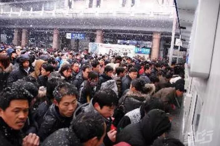 2008年1月28日,汉口火车站广场上客流爆满,检票进站口乘客们在雪中艰难前移。武汉市连日来的强降雪给交通带来极大不便,火车站因列车晚点、停发,滞留了很多回家过年的旅客。