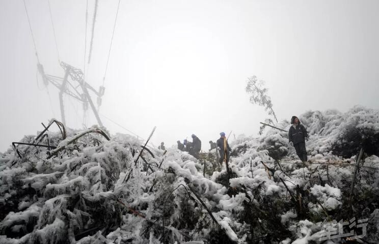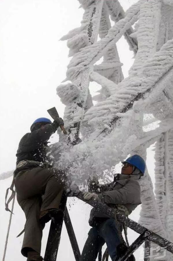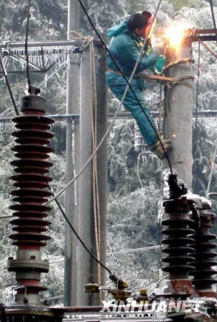 2008年2月5日,来自河南南阳的电力工程人员在湖南郴州王仙岭附近一座被冰雪压塌的输电塔下抢修电网。