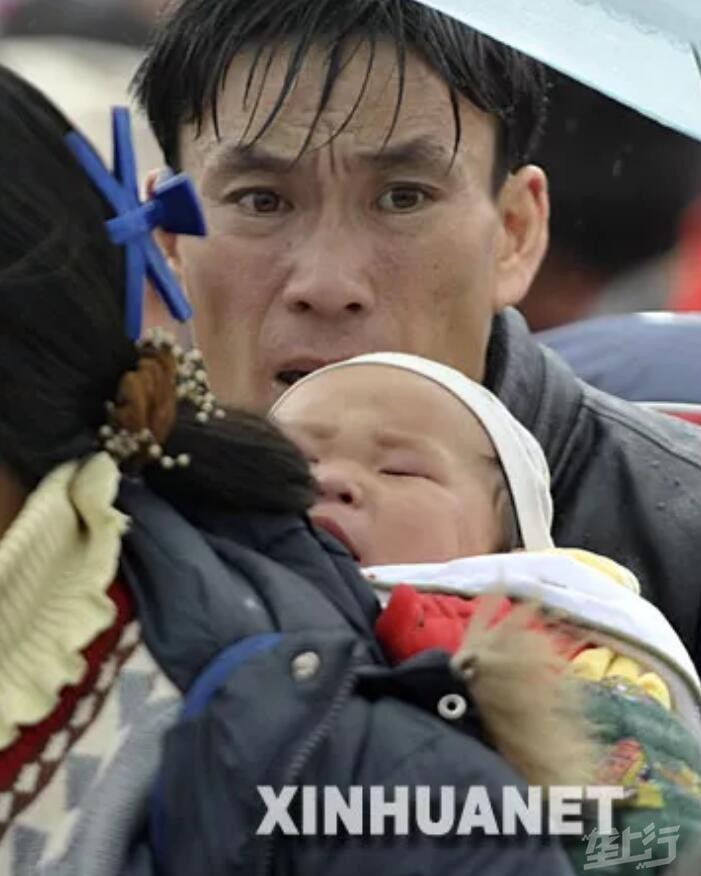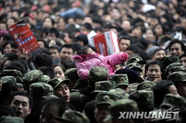 2008年2月1日,武警战士从广州火车站密密麻麻的人群中把一个孩子手递手托举出来。