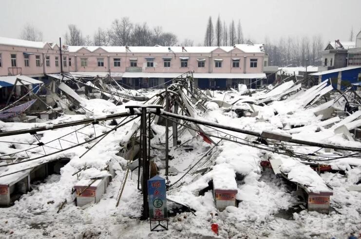 因大雪整体坍塌的安徽省舒城县城关镇孔集农贸市场。(来源:新华网)