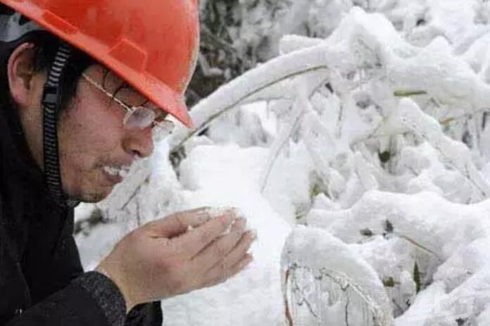 2008年2月2日,一名电力抢险队队员在湖北省通山县抢险现场吃雪解渴。持续的雪灾给湖北省输电线路造成严重破坏,为早日恢复供电,湖北省电力系统3万多名专业抢险队员日夜奋战在积雪覆盖的高山上。