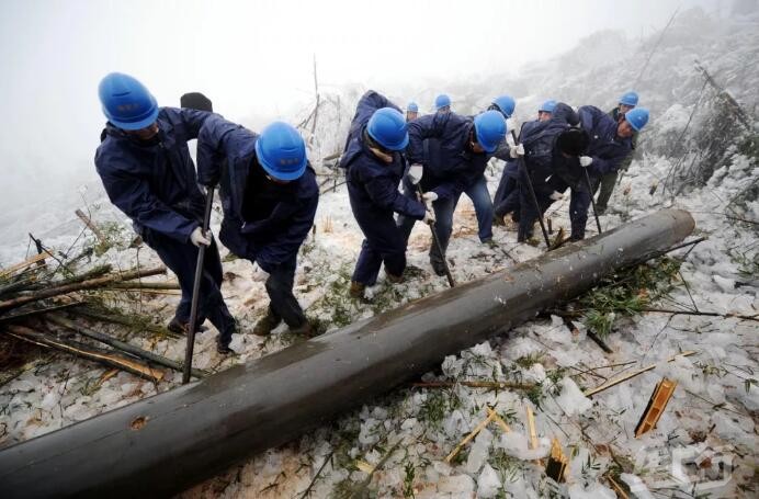 2008年2月5日,来自河南南阳的电力工程人员在湖南郴州王仙岭附近搬运电线杆。国家电网公司调集河南、山东等6省大批技术力量,与当地抢修电网的3000多人一道日夜爬冰卧雪、全力抢修电网。