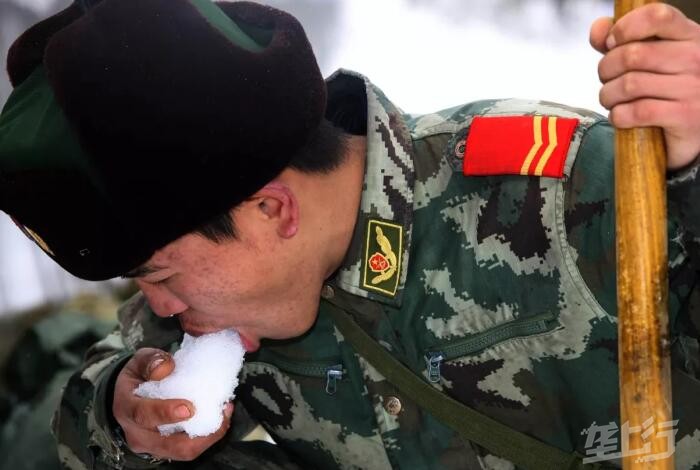 在抢险现场吃雪解渴