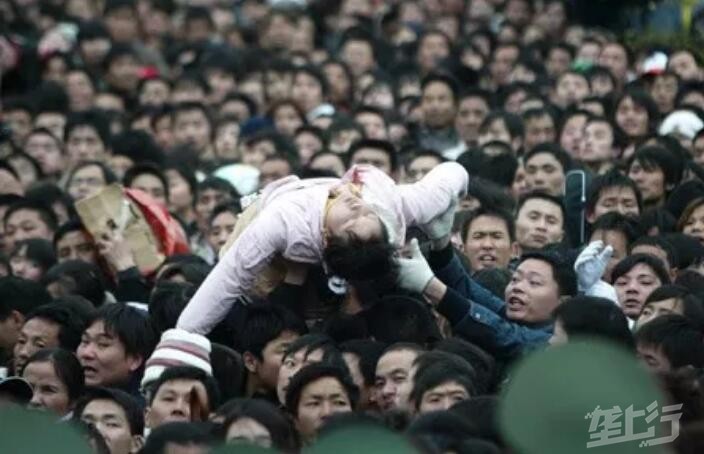 2008年1月31日,广州火车站,部分火车恢复运行,大批旅客聚集在火车站广场外准备进站。一女旅客晕倒在人群中,众旅客抬高以接力的方式把其送进广场救治。