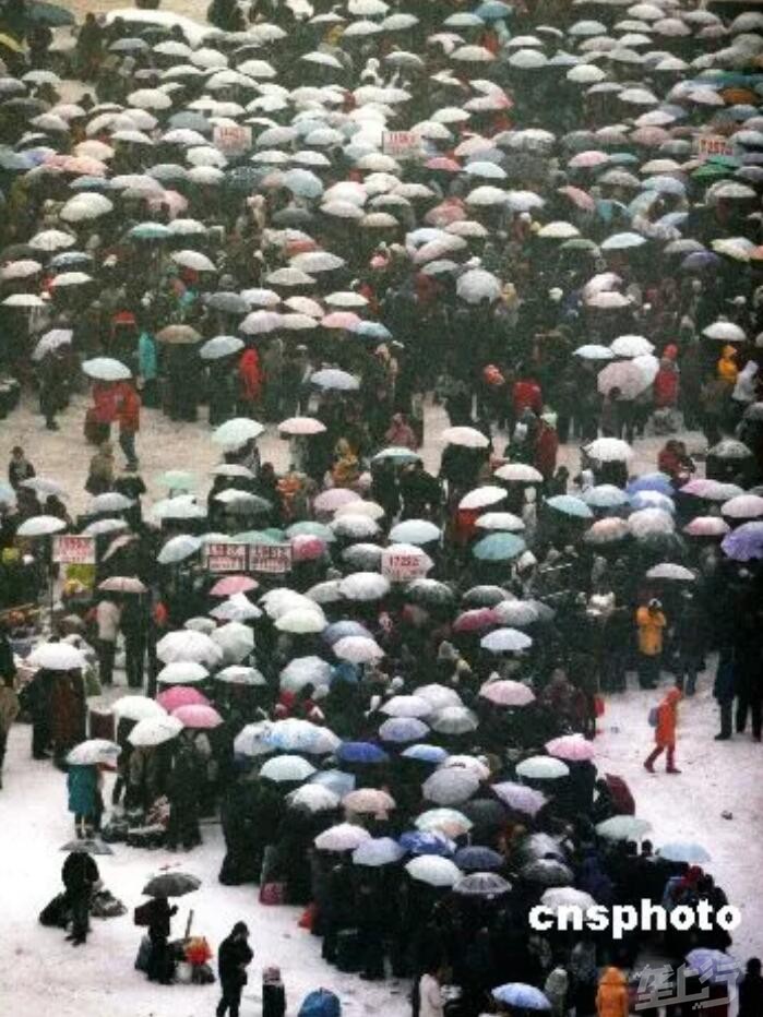 2008年1月19日,安徽合肥,雨雪中拥挤的返乡人潮。