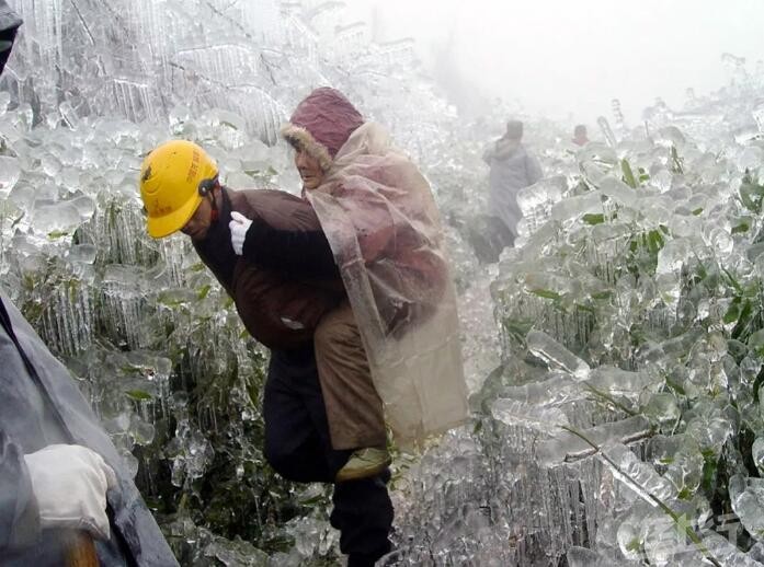 2008年2月3日,营救人员将80岁老人陈章德背出受困的龙南县金莲村。由于连日冰冻天气,江西省龙南县许多偏远山村停电、停水,一些在深山里的民房还被冰雪压塌,出山的路又被冻冰封锁,村民们生活十分困难。