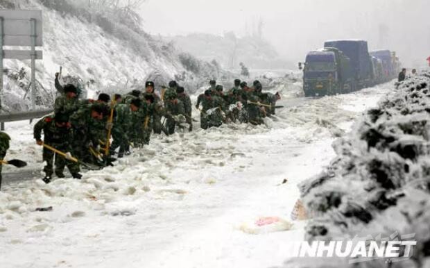 2008年2月3日,武警官兵在京珠高速公路湖南段铲雪。