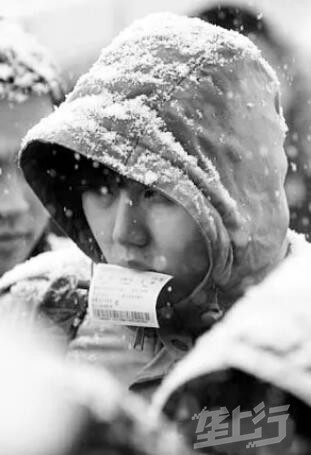 2008年1月27日 一名旅客顶着大雪在合肥火车站进站候车。