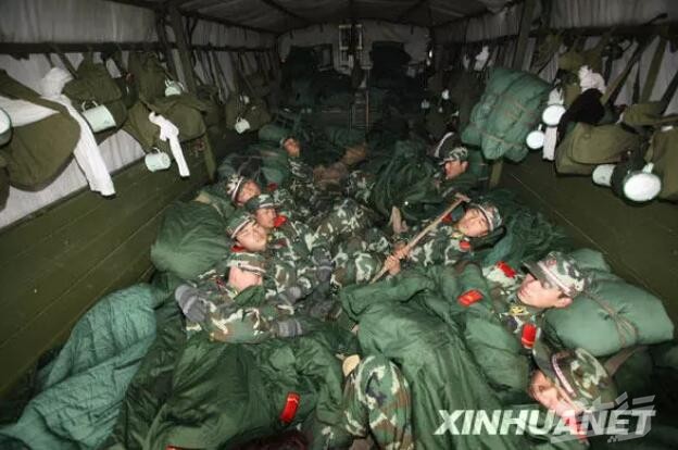 2008年2月4日,因冰雪覆路造成车辆拥堵的京珠高速公路全线贯通。在通车一刻,连续抗灾8昼夜的武警官兵,睡倒在运兵车上。