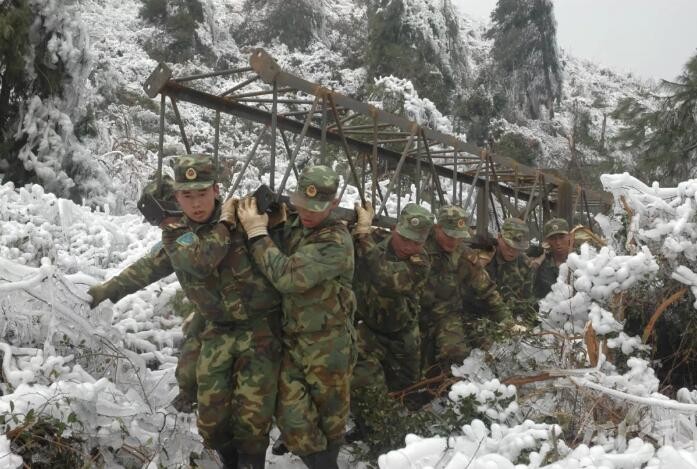 2008年2月6日是农历大年三十,驻桂部队某装甲部队的五百多名指战员争分夺秒抢修电线电塔,以求尽快恢复受冰雪灾害破坏的输电线路。图为装甲旅指战员在冰山雪岭运送电网铁架。
