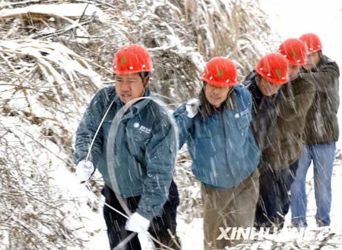2008年1月28日,宣城供电公司水东供电所员工冒着大雪抢修线路。