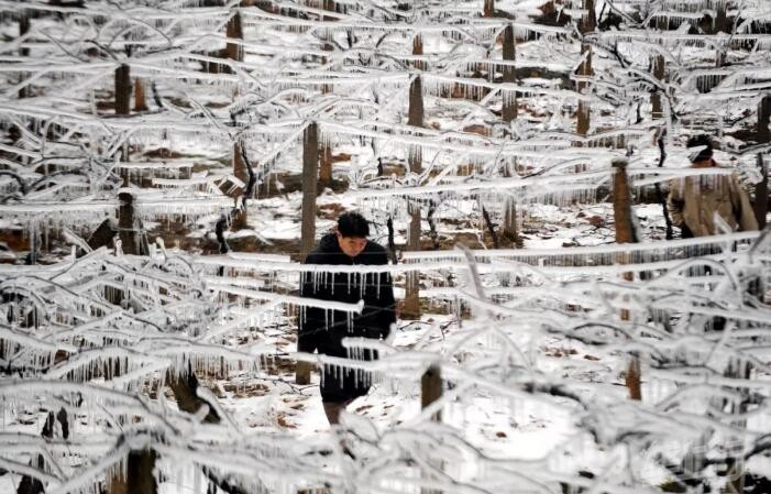 2008年2月4日,湖南郴州苏仙区一位村民从结冰的葡萄架下走过。1月13日以来,湖南郴州地区遭遇50年来最严重的冰雪灾害,农业损失严重。