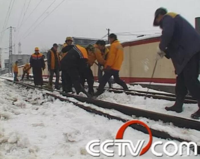 铁路工作人员在铲雪清理铁轨。