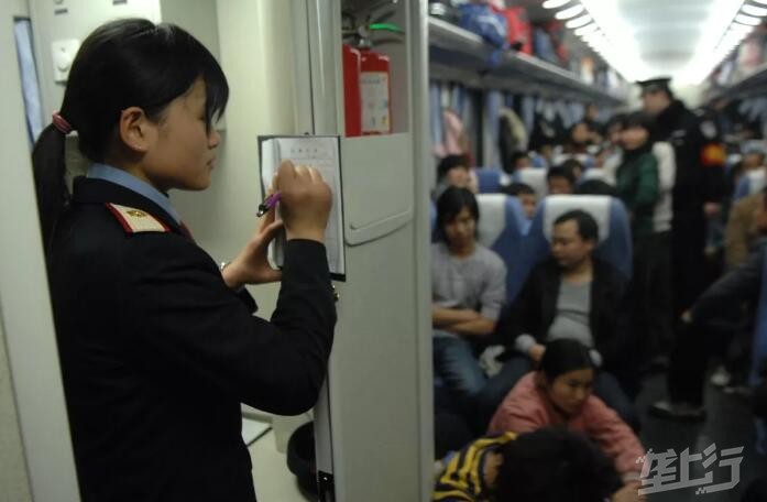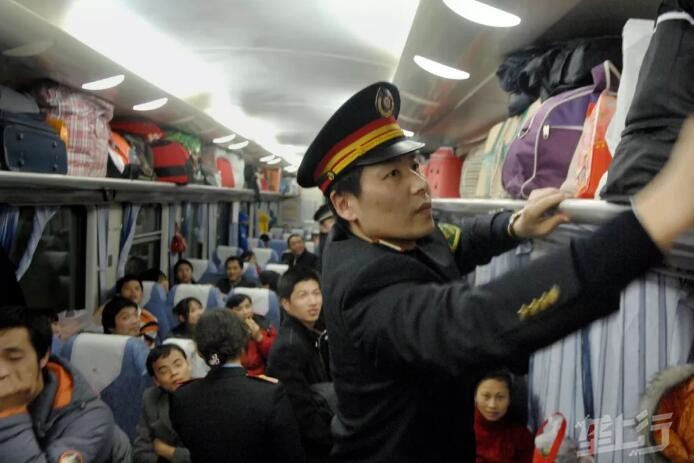 2008年2月8日,上海开往井冈山的K271次列车长郭朝晖在硬座车厢内为旅客整理行李,列车员黄婷婷在硬座车厢做接车记录。由于今年春节前的冰雪灾害造成多条铁路节前客流比往年更集中,旅客们纷纷选择在大年初一、初二相对客流较少的时段乘车,避开春运高峰。